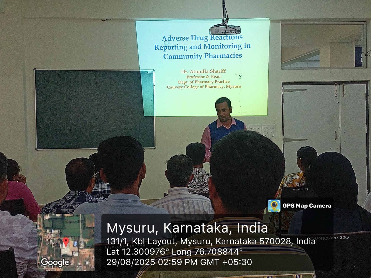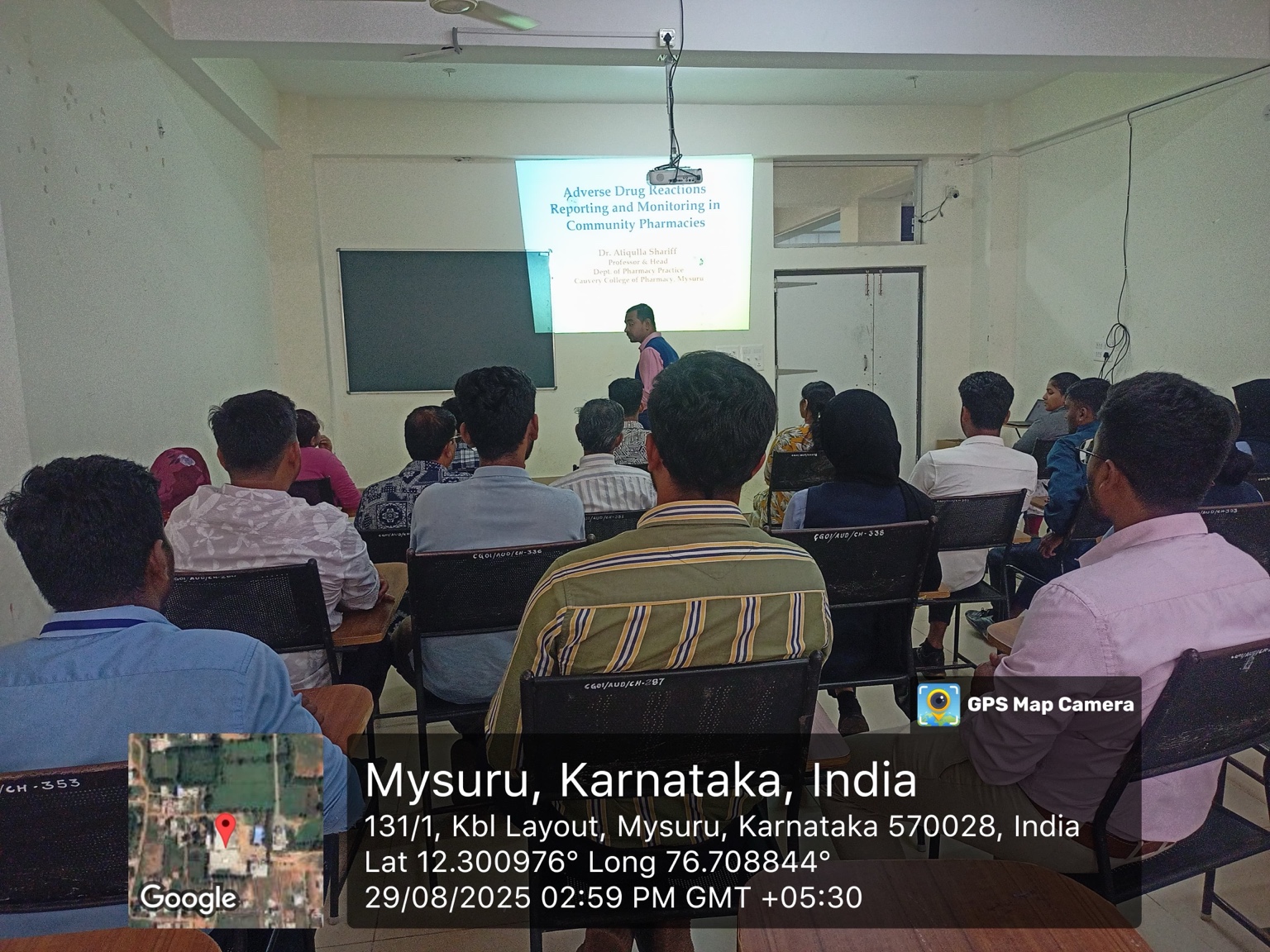 The Department of Pharmacy Practice, Cauvery College of Pharmacy, Mysore, conducted a Session on Adverse Drug Reactions, Reporting and Monitoring in Community Pharmacy on 29th August 2025 from 2:30 PM to 4:30 PM at the college premises.