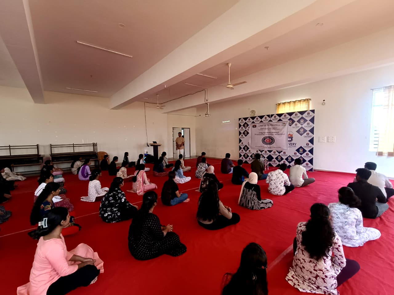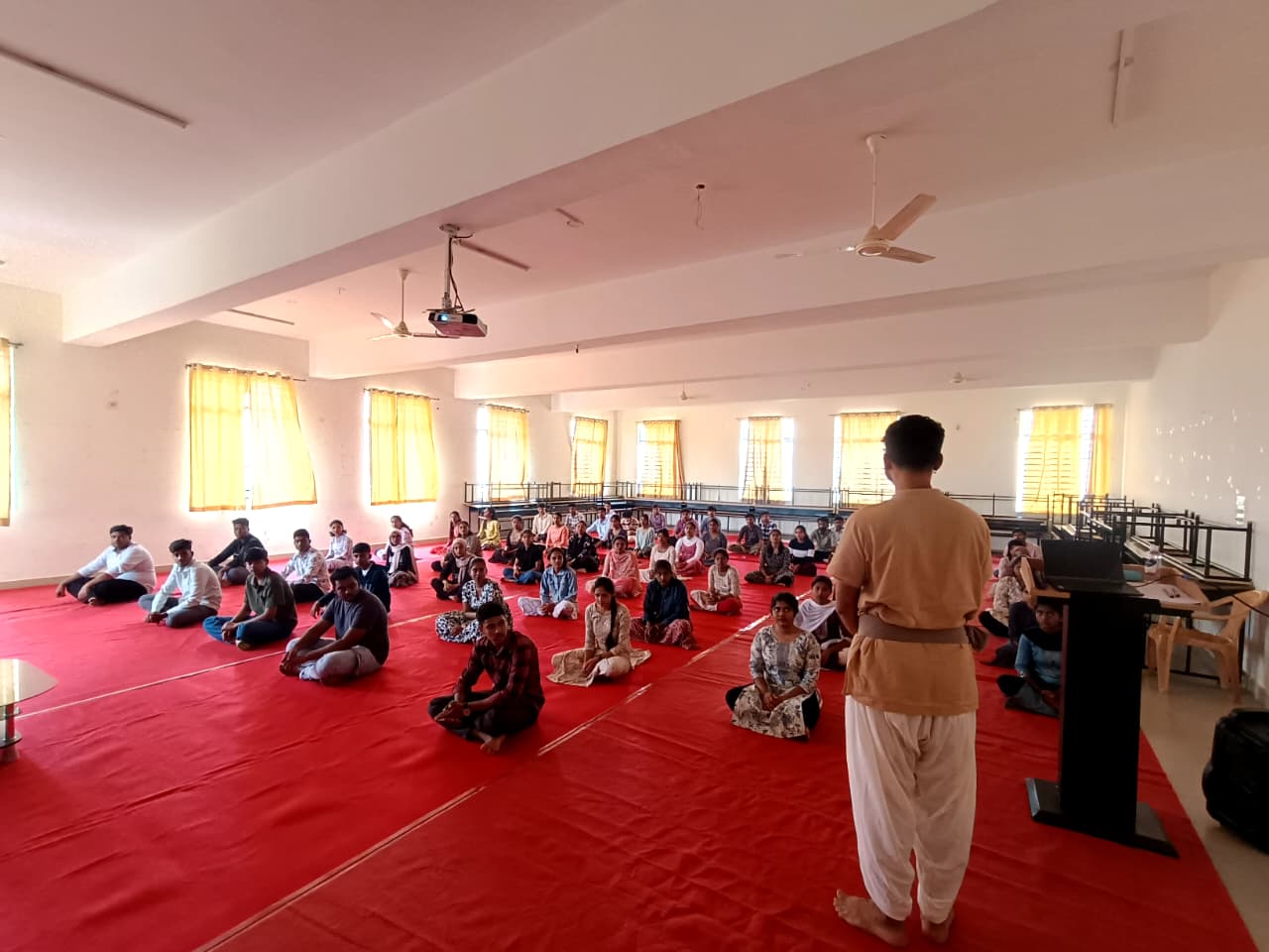 One hour stress management through yoga was conducted for B.Pharm I Sem students by Sadguru foundation on 15.10.2025 11:00 AM – 12.30 PM